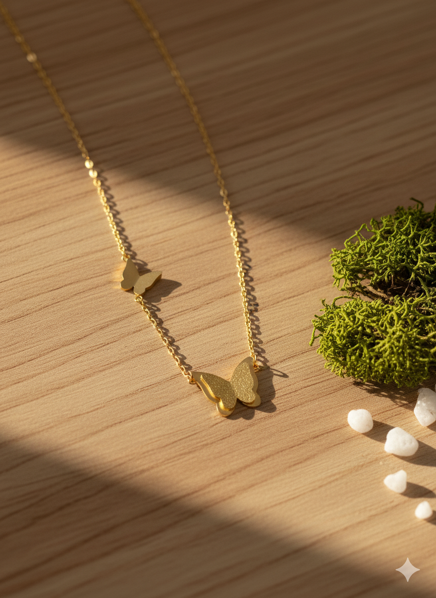 A graceful piece where two golden butterflies take flight. This delicate lariat-style chain features a subtle butterfly accent near the collarbone and a larger, sparkling textured pendant below. A perfect blend of simple elegance and natural charm.