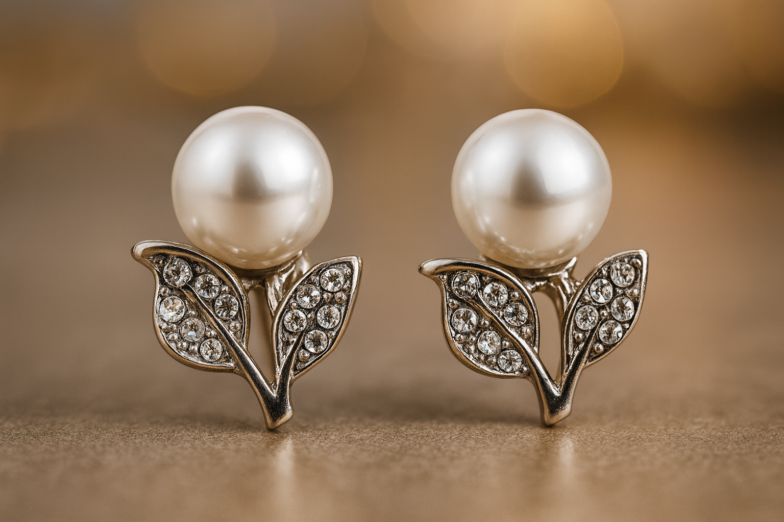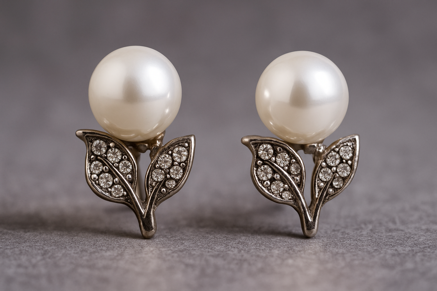 Elevate your elegance with these exquisite pearl stud earrings. Each piece features a lustrous, high-shine pearl delicately set atop dual metallic leaf motifs encrusted with shimmering cubic zirconia stones. The leaves gracefully cradle the pearl, giving the earrings a timeless floral silhouette. The intricate detailing and subtle sparkle make them the perfect blend of classic charm and modern sophistication.