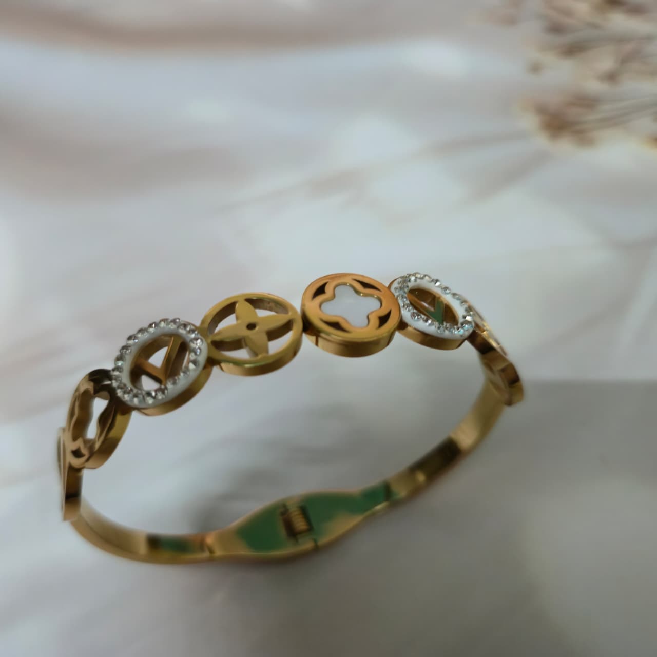 Elevate your style with this sophisticated gold-tone bracelet featuring a series of intricate motif charms. Crafted for durability, it comes with an anti-tarnish finish to maintain its radiant shine over time. The secure clasp ensures a comfortable and adjustable fit, making it perfect for everyday elegance or special occasions. A timeless accessory that blends modern design with classic charm.