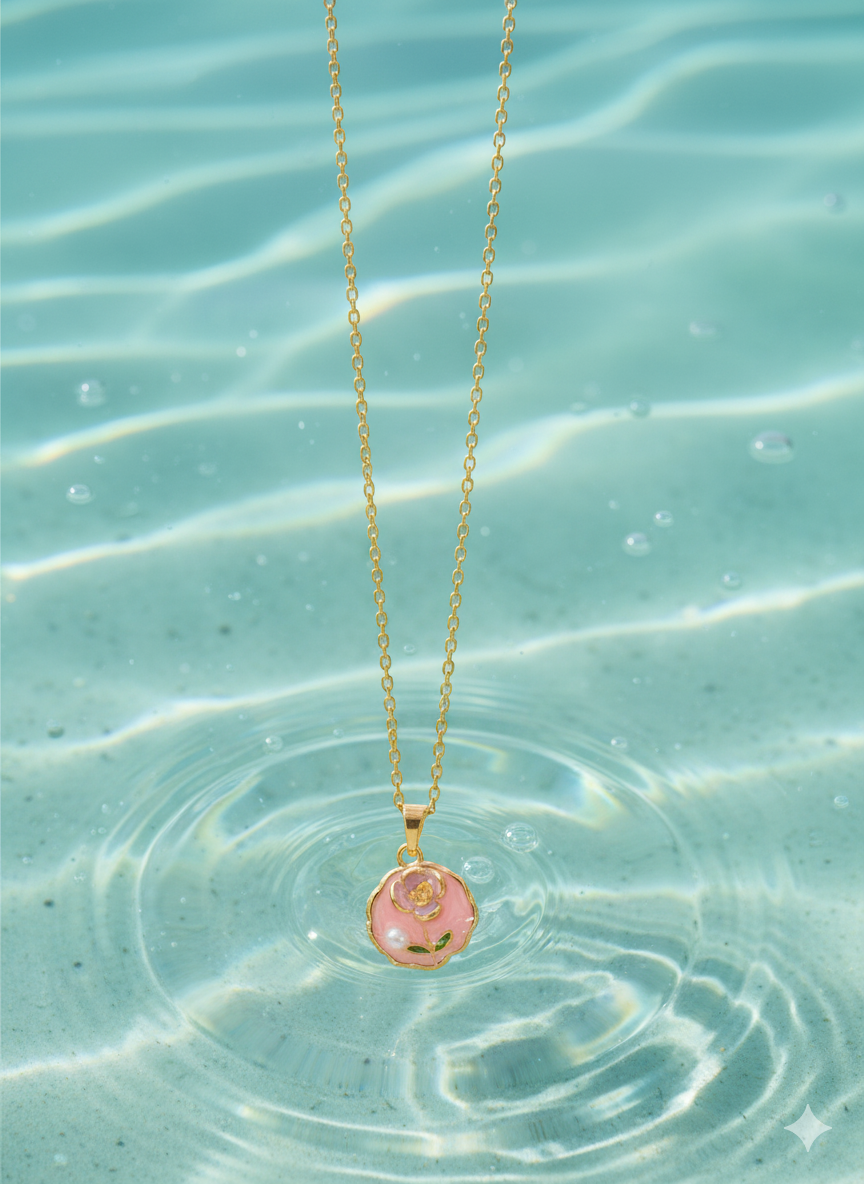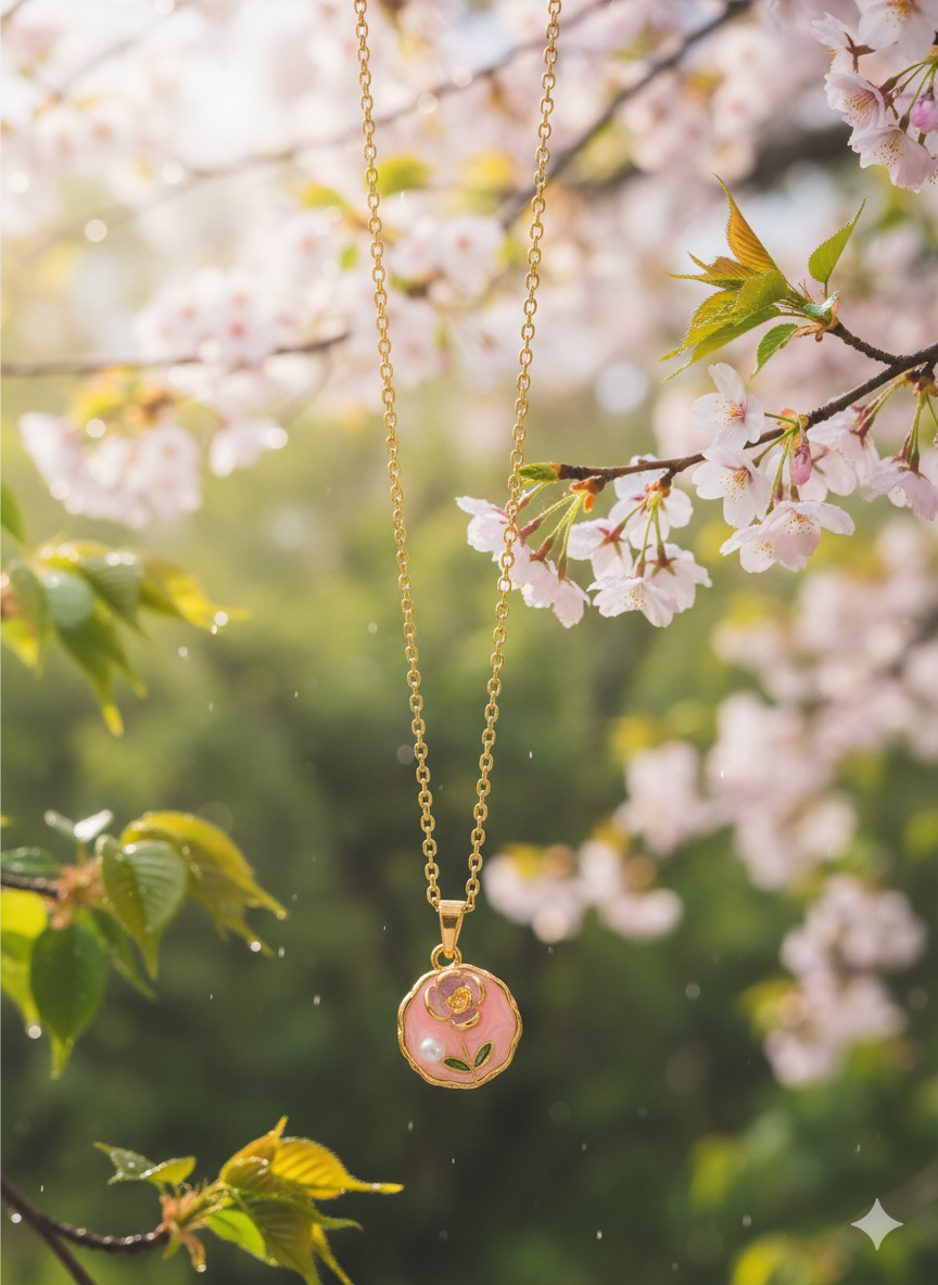 A romantic, vintage-inspired pendant featuring a gold-tone scalloped bezel. It holds a pink resin disc preserving a delicate dried flower and foliage, accented by a single lustrous pearl. It hangs from a fine gold chain.