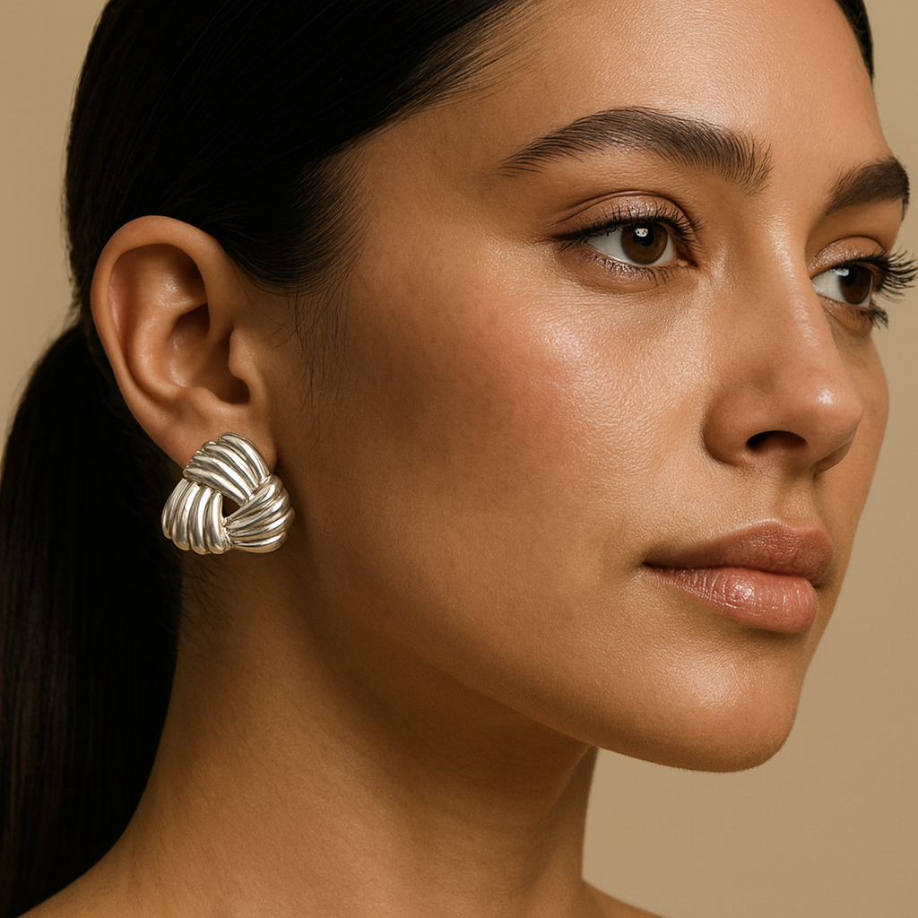 Make a bold yet sophisticated statement with our Silver Swirl Luxe Studs. Crafted in a radiant silver finish, these triangular studs feature a dynamic, wave-like pleated design that creates a stunning interplay of shine and shape. Their sculptural structure adds an element of modern elegance, making them perfect for both formal affairs and chic everyday looks. Lightweight and versatile, these earrings effortlessly elevate your ensemble with a touch of metallic glamour.