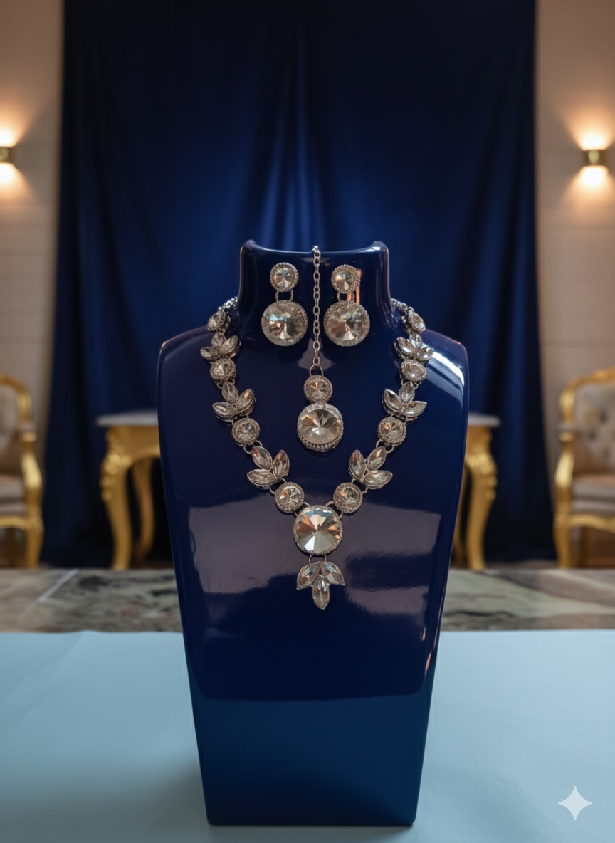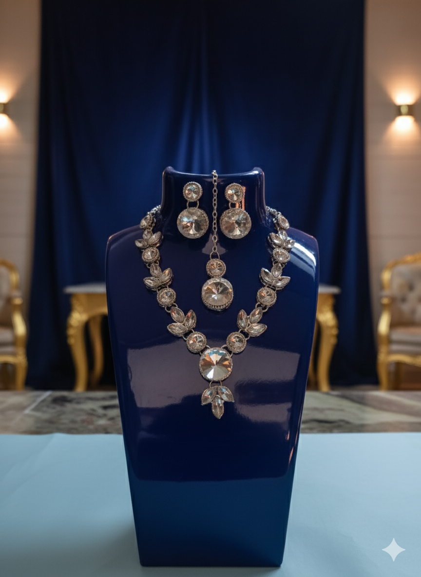 The Crystal Cascade is an exquisite statement set, featuring a cascading array of brilliant-cut stones designed to captivate at any gala or high-profile event. It offers unmatched sparkle and a look of true, effortless luxury.
