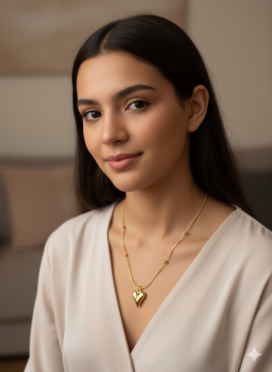A timeless symbol of devotion, this necklace captures the strength and sincerity of a true commitment. A sleek, polished heart pendant, radiating in brilliant gold, hangs from an elegant serpentine chain punctuated by delicate golden beads. It’s more than jewelry—it’s a silent, shining promise worn close to the heart, a testament to everlasting love.