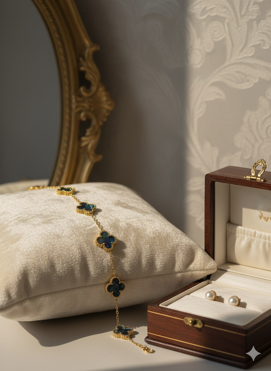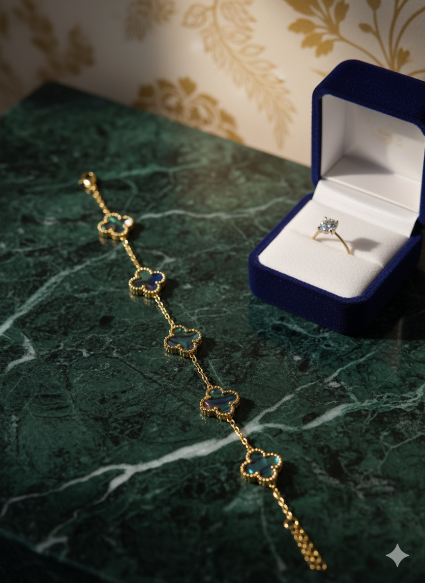 The bracelet features five iconic Quatrefoil (four-leaf clover) motifs, each meticulously set with a custom-cut, highly iridescent inlay in captivating tones of Turquoise Blue. The rich color shifts dramatically with every movement, creating a singular visual depth that speaks to rarity and exclusivity.